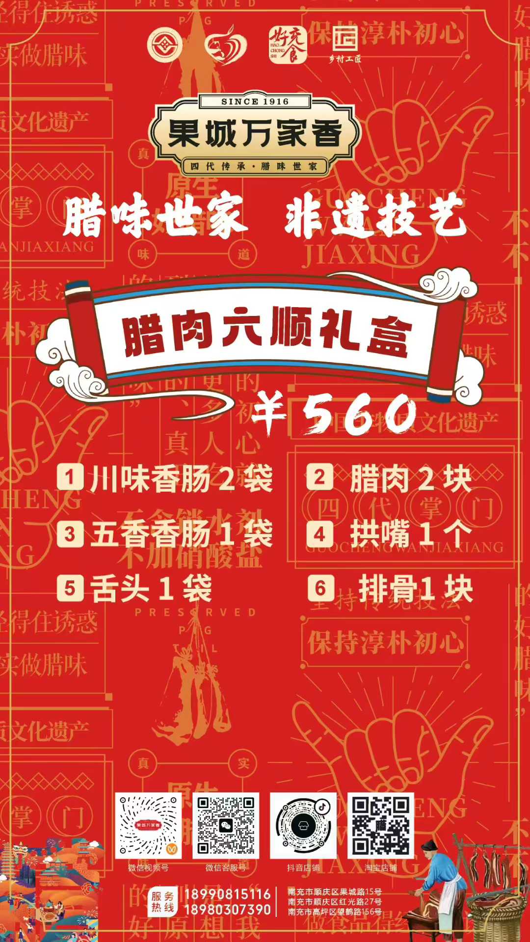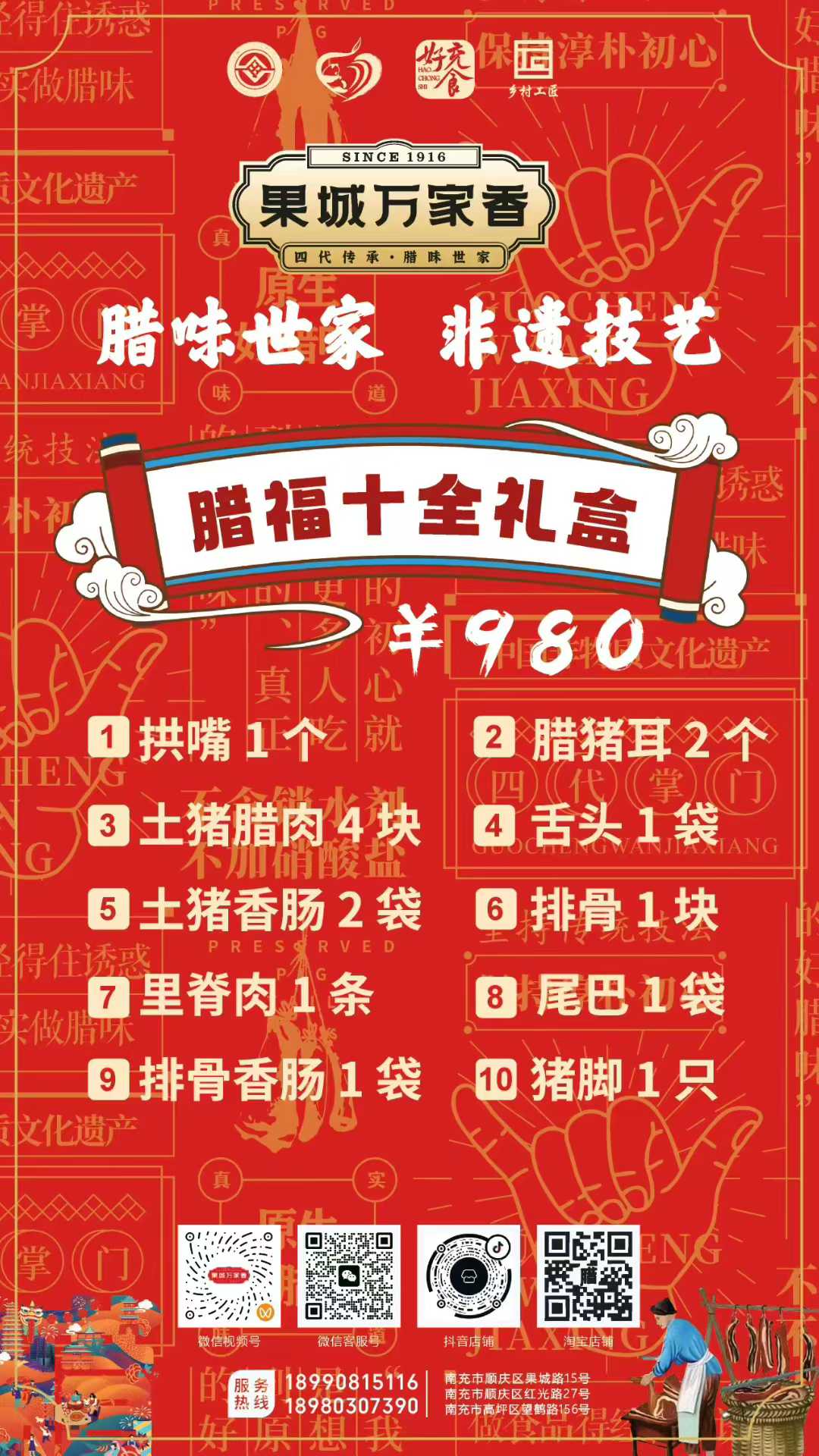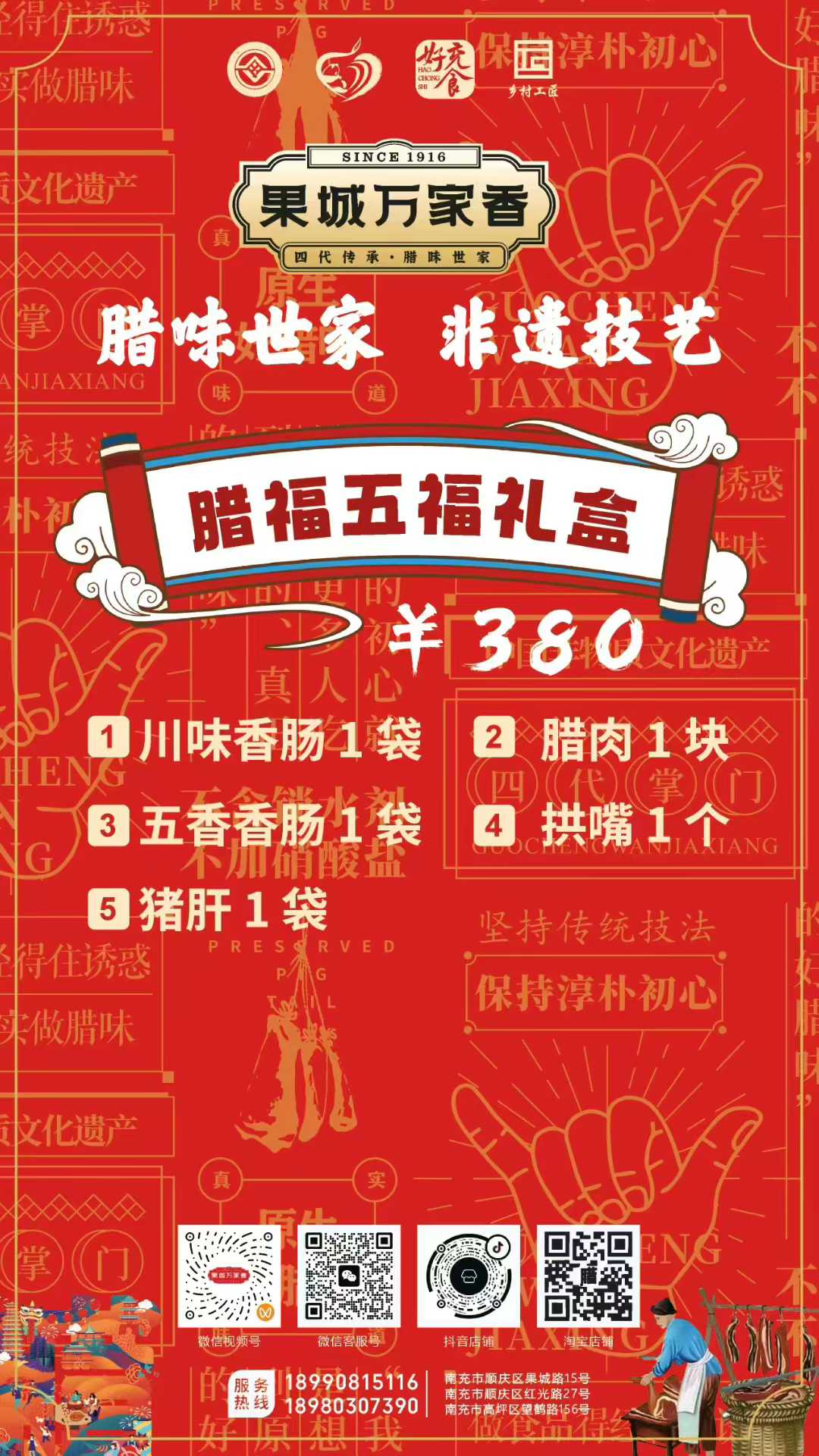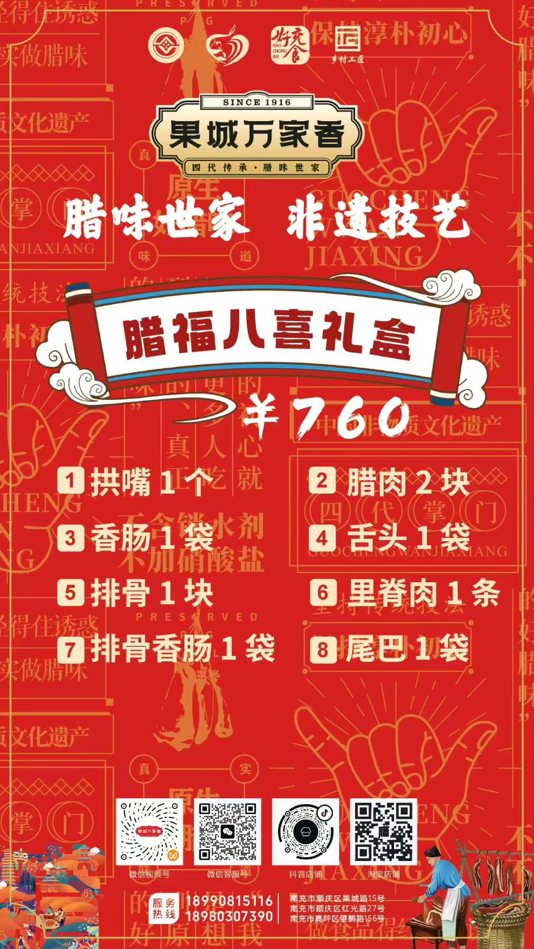 為滿足消費者多樣化的節(jié)日需求,萬家香特別推出了臘福五福、臘肉六順、臘福八吉、臘福十全、臘福滿堂等多款禮盒,從380元到1200元不等,涵蓋臘肉、香腸、拱嘴、豬耳等十余種臘味單品,無論是家庭團聚還是走親訪友,都能找到稱心之選。